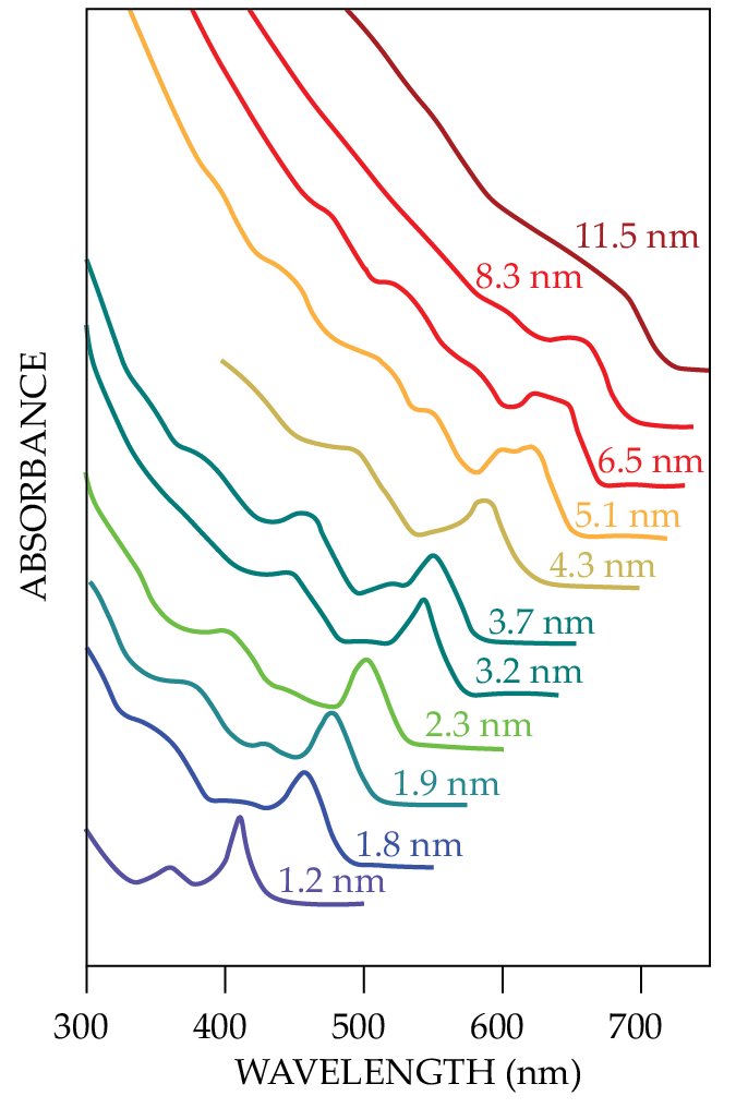 But new behavior emerges when a semiconductor shrinks to a few nanometers in size. When electrons in nanocrystals get excited, the emitted photons can have only certain allowed energies. And as the space that an electron can occupy shrinks, so too do the allowed values of its wavelength, according to the particle-in-a-box model in quantum mechanics, and the bandgap of the semiconductor widens.