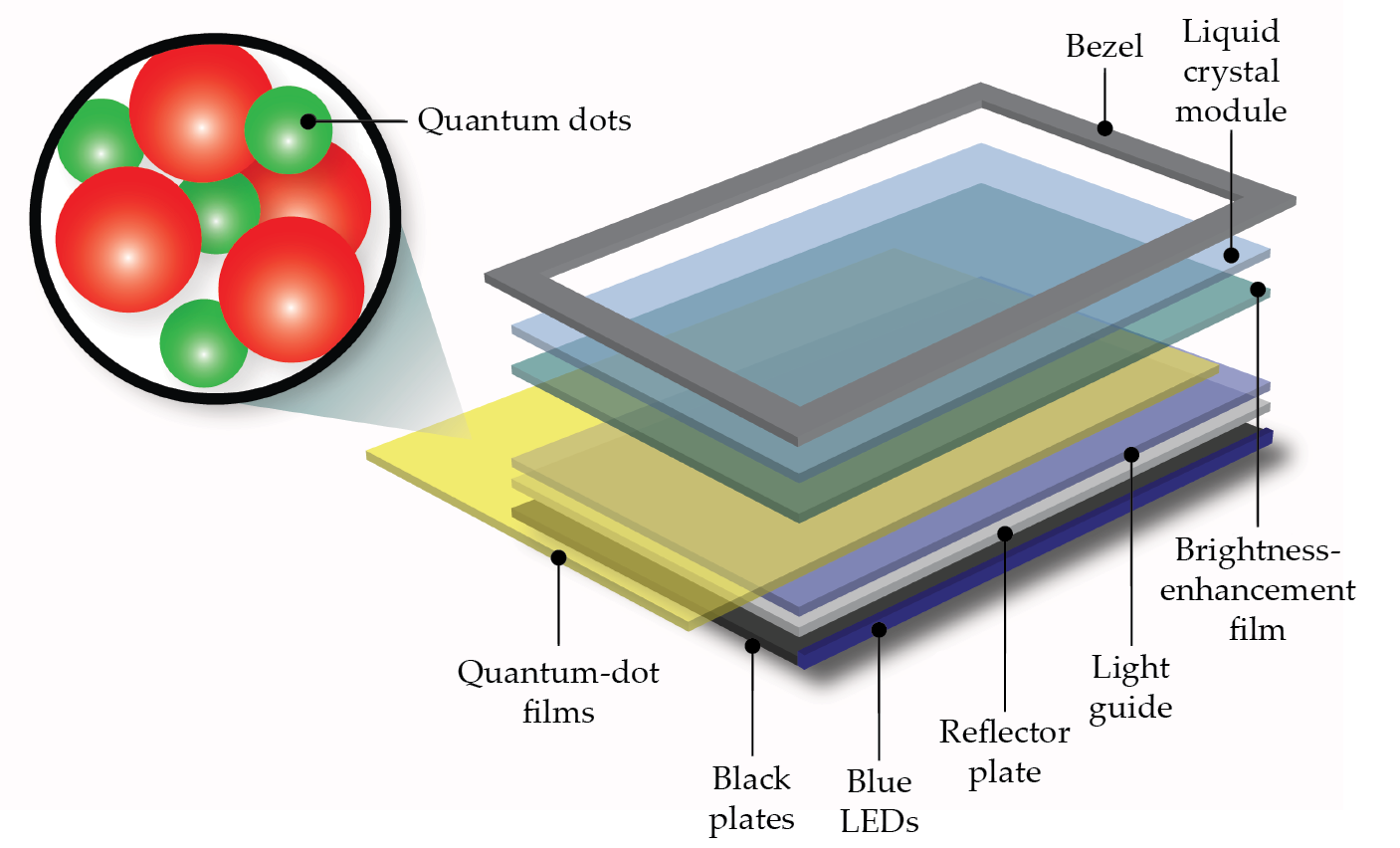 The ”Q” in Samsung’s QLED TVs, for example, stands for the monolayer of quantum dots that’s included in the screen, shown in figure