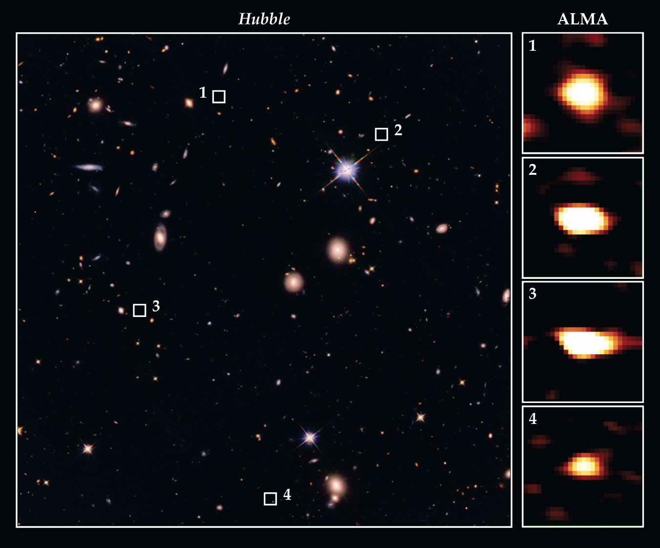 But the galaxies are still very faint at 4.5 µm, and measurements with better spatial resolution and at multiple wavelengths would reveal more about their properties. The researchers knew they needed a facility such as ALMA, with detection in the far-IR. Taken in the summer of 2016, their ALMA images resolved the galaxies and confirmed that 39 of the previously identified objects are star-forming massive galaxies invisible in the Hubble images: Four are shown in figure