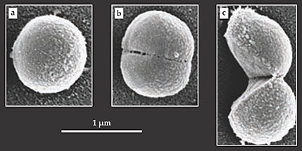Scanning electron microscope images capture Staphylococcus aureus cells (a) well before, (b) just before, and (c) just after division. The bacterium’s split is swift; it takes only a millisecond or so for a single cell to separate into two. That process, known as popping, is thought to be mediated by a stress-induced crack in the cell wall. (Adapted from ref.