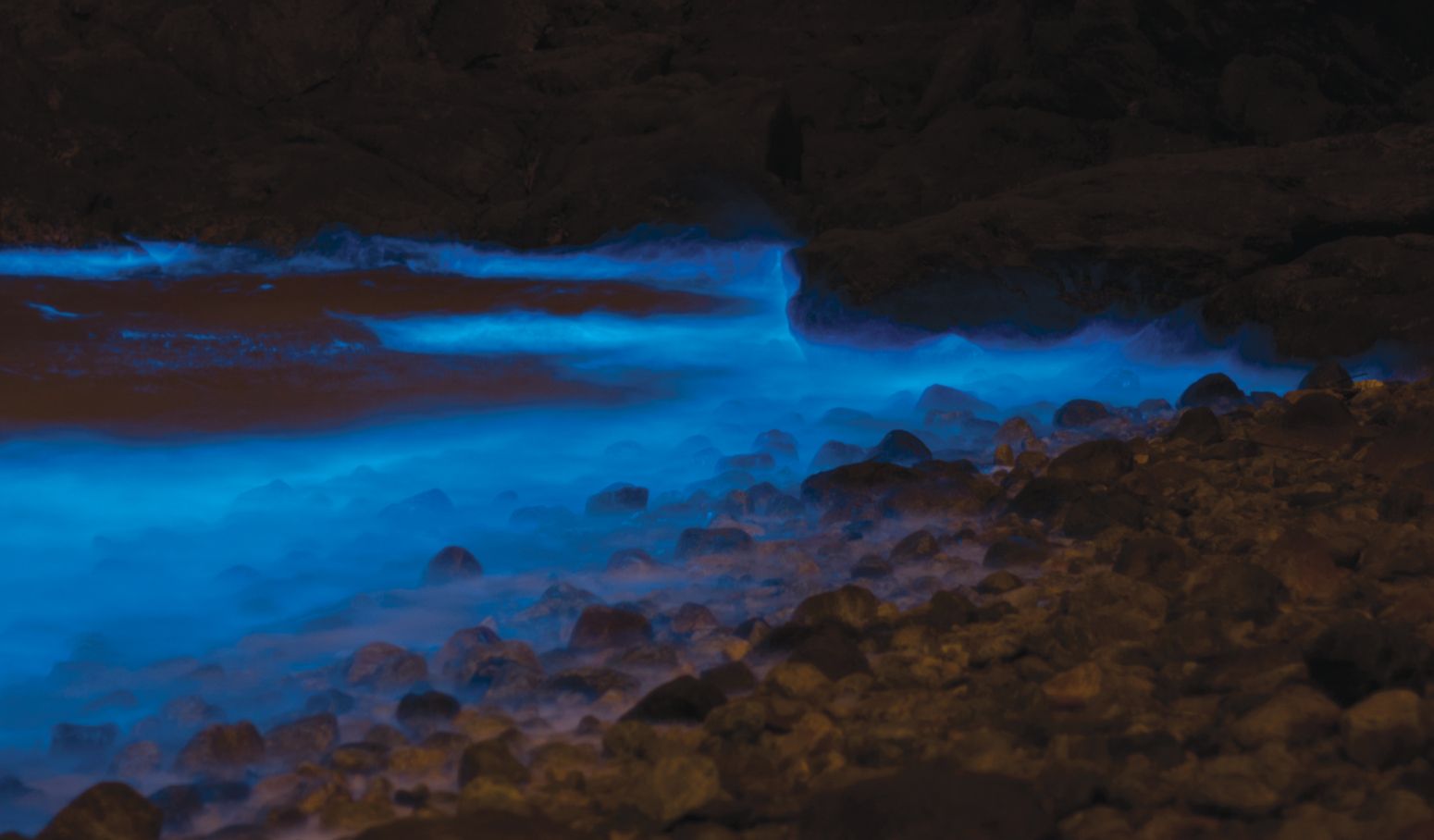 Swarms of the dinoflagellate Noctiluca scintillans emit blue light that illuminates the coastline in Taiwan. In historical accounts of nautical adventures, mariners marveled at the milky seas caused by bioluminescence. (Photo by RobbinChang.)