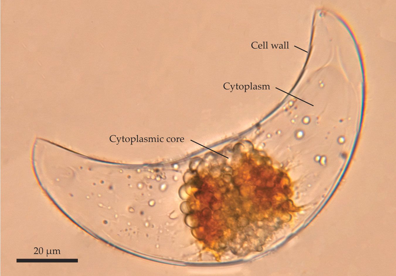 A single cell lights up. The unicellular marine phytoplankton Pyrocystis lunula is a common subject for bioluminescence studies. The organism’s cytoplasmic core emits flashes of light when external stresses push on the cell wall. (Adapted from ref.