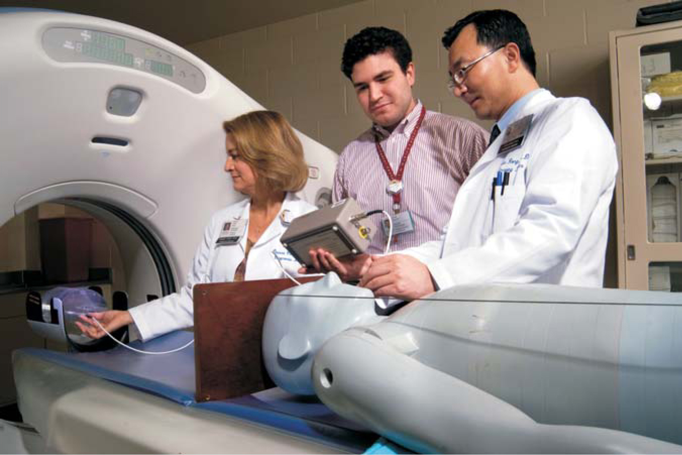 A human phantom is used for radiation dosimetry point measurements by medical physicists Dianna Cody and John Rong (right) and physics technologist David Zamora (middle) at the University of Texas’s M. D. Anderson Cancer Center.