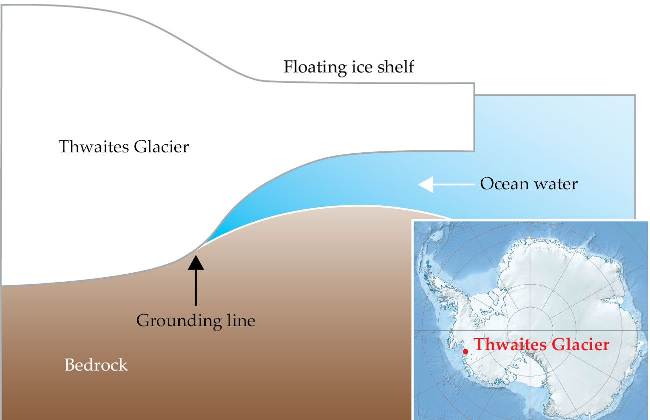 Below Thwaites Glacier, in western Antarctica, the land slopes downward away from the ocean. When relatively warm water interacts with the cold ice, the grounding line beyond which the glacier is no longer supported by bedrock retreats landward, making the ice shelf extending over the ocean less stable and thus more prone to collapse. (Inset by Alexrk2, Wikimedia Commons, CC BY-SA 3.0
