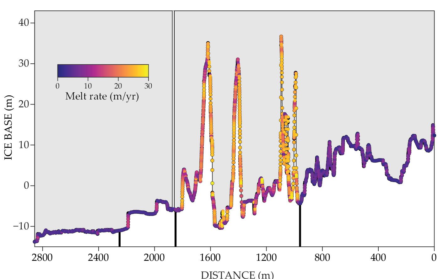 Under those assumptions, models predicted that Thwaites Glacier is melting at a rate of 14–32 m/yr, which is an order of magnitude higher than the 2–5 m/yr observed for the flat parts of the ice base by the new papers. Davis and colleagues argue that the discrepancy arises because the models didn’t account for the observed density stratification in the ocean beneath the flat regions on the underside. 4