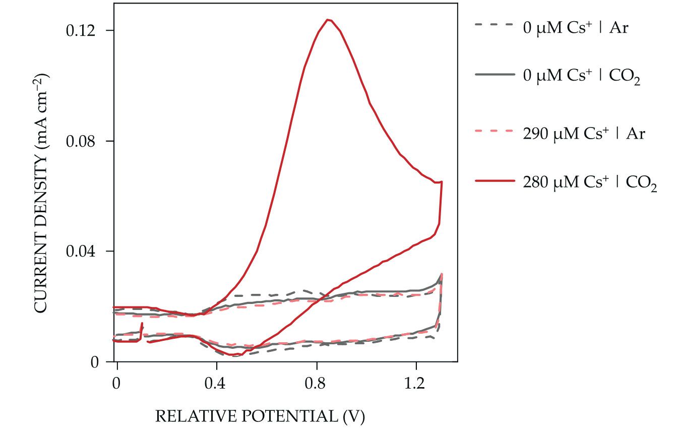 The researchers also measured the effect of alkali metal ions lighter than Cs. The largest cation, Cs+, showed the highest activity for CO2 reduction, followed by progressively smaller cations, an observation that agrees with previous studies.