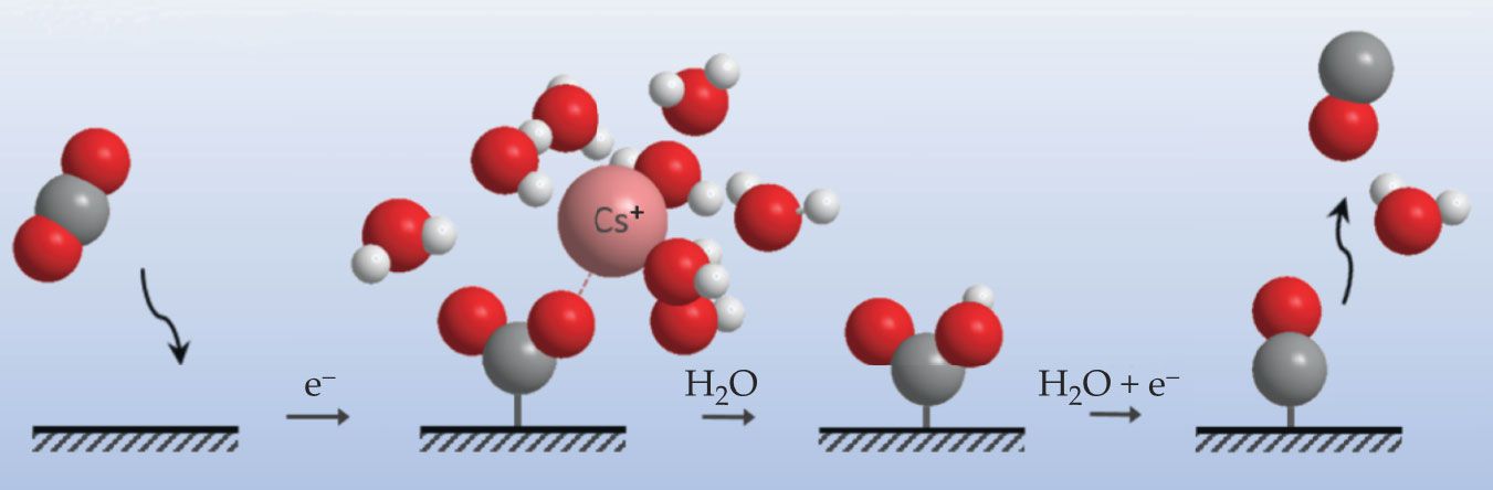 A cesium cation in the electrolyte hosts several water molecules in its vicinity. Because of cesium’s large ionic radius, each water molecule consequently has a weak attraction to the cation. That property allows Cs+ to move close enough to the surface of an electrode and interact with an intermediate molecule in the reduction reaction of carbon dioxide to carbon monoxide. The interaction stabilizes the adsorbed molecule and is critical for the reaction to proceed to completion. (Adapted from ref.