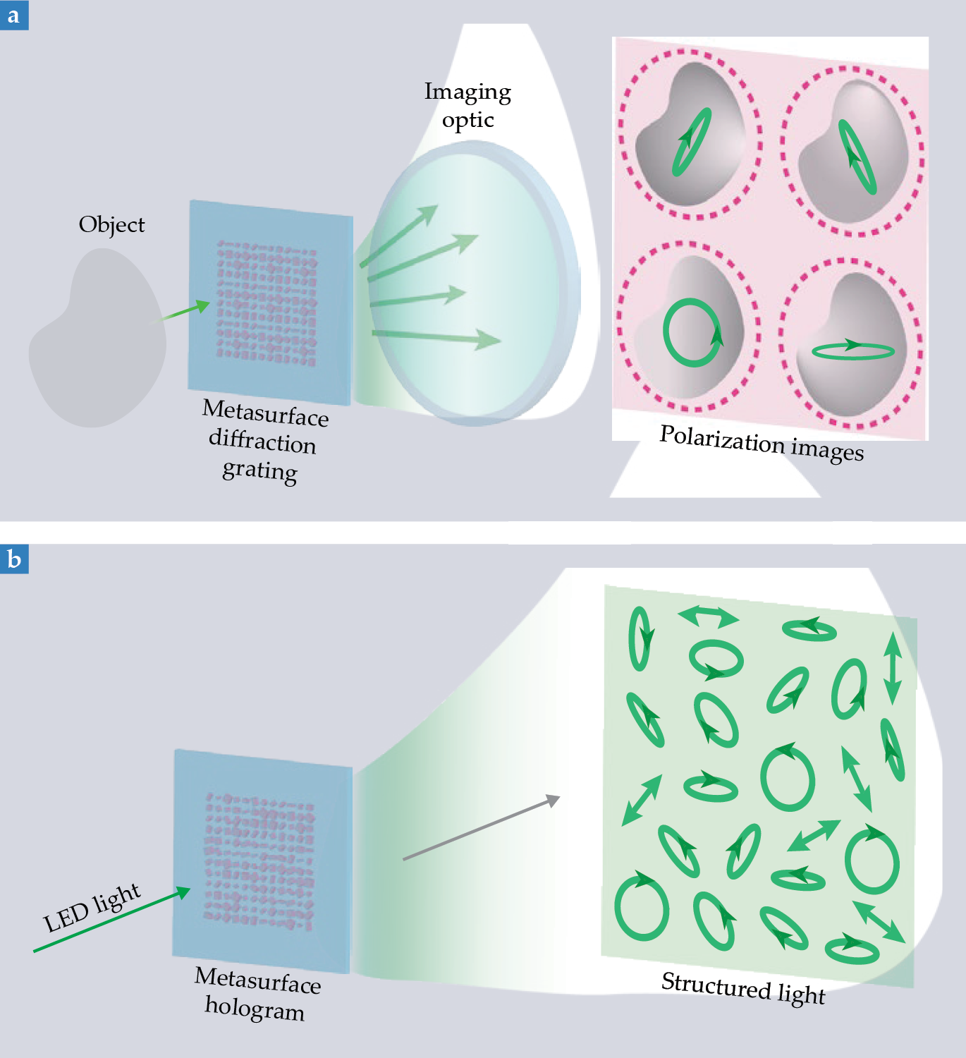 Metasurface optics made of tiny dielectric pillars have extraordinary power to shape the intensity and polarization patterns of light waves. (a) A metasurface diffraction grating can split the light coming off an object into four images of independent polarization states. (b) And a metasurface hologram can transform initially unpolarized light from an LED into structured light whose polarization varies on a fine spatial scale. Combining the two yields a system that can image an object’s 4 × 4 Mueller matrix, which captures all of its polarization-changing properties. (Adapted from ref. 1.)