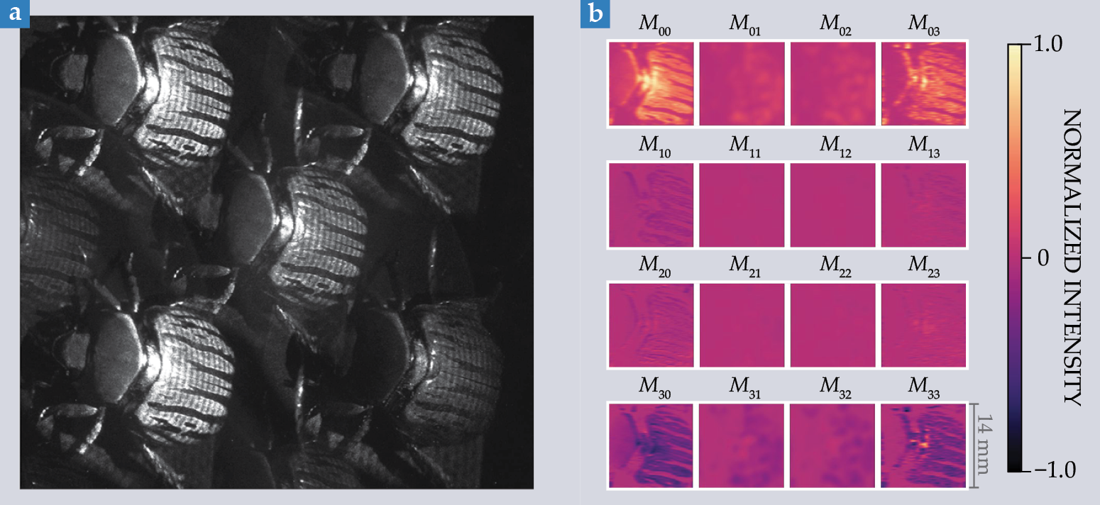 For one of their proof-of-concept experiments, the researchers imaged the chiral beetle—which, as the name suggests, has an unusual asymmetric effect on light. Figure 2a shows the four raw Stokes images. (The fifth image, in the center, is the zero-order, undiffracted light, which carries no additional polarization information.) Although too small to see, tiny fluctuations in the images encode the effects of all the polarizations of the structured light. From those, the researchers computed the Mueller matrix, shown in figure 2b.