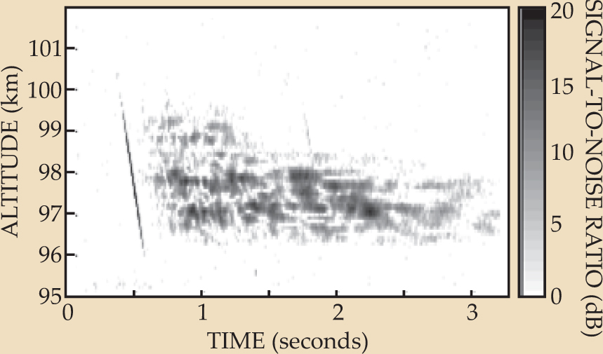 Figure 1. Collisions of a tiny meteor with thermospheric air leave a trail of electrons and ions whose evolution in space and time can be measured. Jicamarca Radio Observatory’s large radar array at Earth’s geomagnetic equator recorded 5000 reflections per second for each altitude bin. The thin streak represents the “head echo,” the leading edge of the ionization front. Once it starts flowing, an initially smooth column of hot plasma (invisible to radar) becomes turbulent as instabilities in the plasma give rise to irregular clumps that align with the magnetic field. Note the appearance of a second, faint head echo 1.5 seconds after the first when another meteor flies through the beam.