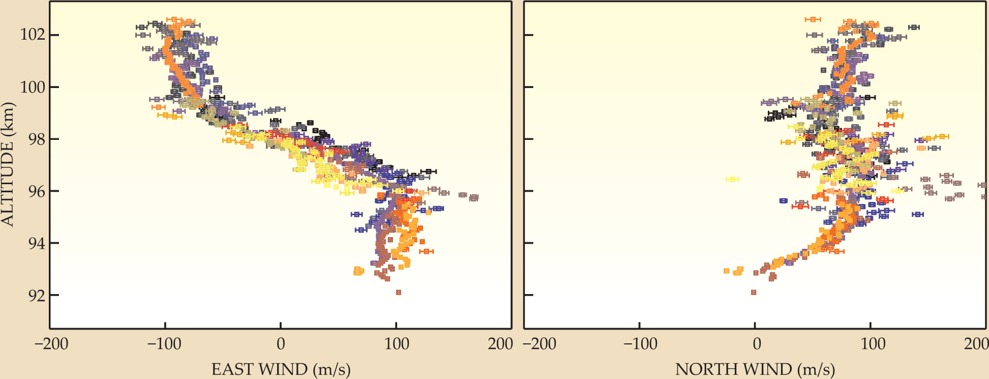 Meers Oppenheim and his colleagues from Boston University, Peru’s Jicamarca Radio Observatory (JRO), and Los Alamos National Laboratory now offer an alternative approach 2 that has its origins in another 50-year-old technique. Free electrons produced in the plasma trails of incoming meteors make an ideal radar target. They also work well as wind tracers: The plasma preserves its charge neutrality such that the highly mobile electrons remain closely tied to heavy ions that are swept along in the neutral wind. For decades aeronomers have inferred wind speed based on the average Doppler shift they record from specular echoes, reflections from the trails when their paths lie normal to the radar beam. But those echoes give just one velocity component at one height at one time from each meteor. The averaging required to combine many meteor signals into a wind profile washes out the fine structure.