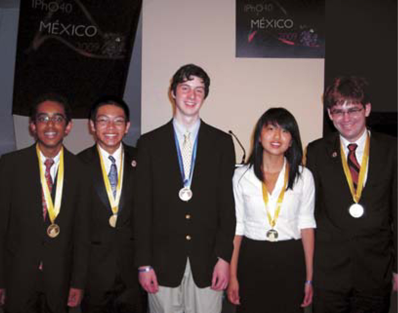 South Korea, India, and the US, with total scores in descending order, each took home four gold and one silver medal. The US competitors were David Field (silver medal; center in bottom photo) of Andover, Massachusetts, and, from California, Bowei Liu and Marianna Mao (flanking Field), a sophomore and senior, respectively, at the same high school in Fremont; Anand Natarajan of San Jose (far left); and Joshua Oreman of Los Angeles.