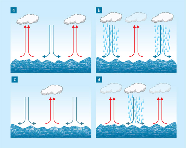 Figure 1. Some marine stratocumulus clouds seem to periodically vanish and reappear, possibly via the mechanism illustrated here. (a) Thermal convection circulates warm air (red arrows) upward and cool air (blue arrows) downward, with the updrafts producing clouds. (b) As the clouds precipitate, evaporative cooling reverses the convective pattern, creating a new updraft, and a new cloud, several kilometers away. (c) With the original clouds converted entirely to rain, a new cloud hovers above the new updraft of warm air. (d) As rain falls from the newly formed cloud, the patterns again reverse, and the cycle repeats.