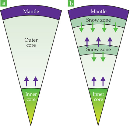 In 2008 Bin Chen, Jie Li (both then at the University of Illinois at Urbana-Champaign), and Steven Hauck II (Case Western Reserve University, Cleveland, Ohio) showed that when molten iron contains a sufficiently large admixture of sulfur and is compressed to Mercury-like pressures, iron can spontaneously precipitate—even when there’s no solid–liquid interface to seed the phase change. 3 They predicted that precipitation could potentially occur in two layers, so-called snow zones, inside Mercury’s core. Sources of heavy precipitates and buoyant light elements, the snow zones (depicted in figure 1b) would further stir the dynamo.
