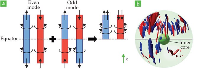 Figure 2. Symmetry breaking in dynamos. (a) Interactions between even and odd flow modes in a planetary dynamo tend to enhance flow in one hemisphere and diminish it in the other. (Straight black arrows indicate the velocity component in the direction z of the spin axis; curved arrows indicate vorticity.) (b) In a dynamo simulation, the interactions between modes manifest as an asymmetry in helicity—a measure of the flow’s combined velocity and vorticity. (In both panels, red and blue denote regions of positive and negative vorticity, respectively.) (Adapted from ref.