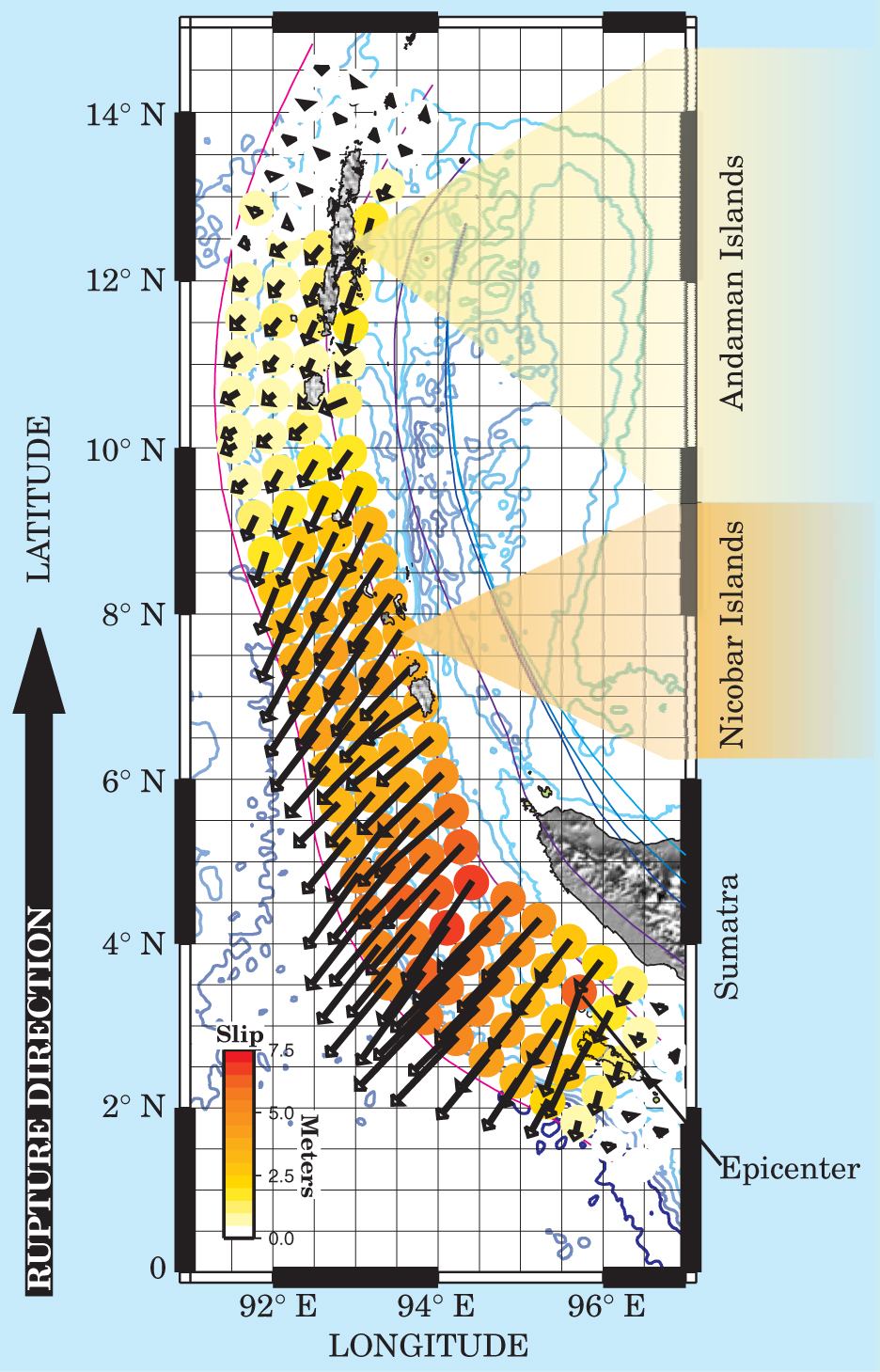 Figure 1. How and where did the plate slip occur during the 26 December 2004 earthquake? Each colored disk in this model represents a 50-km-diameter point source; slip vectors point in the direction of local plate motion. Starting off the coast of Sumatra, the rupture progressed northwest like a propagating crack, unzipping first toward the Nicobar Islands and then toward the Andaman Islands about 1200 km from the epicenter. The displacement, or slip, of rock across the fault surface reached a maximum of about 15 m in places. As the rupture neared its northern end past the Nicobar Islands, the slip magnitudes dropped to just 1–2 meters and the orientation of the plate motion became nearly parallel to the fault. This seismic model’s reliance on surface waves with long period (a few hundred seconds) captures the directionality but somewhat underestimates the full magnitudes of the displacement.