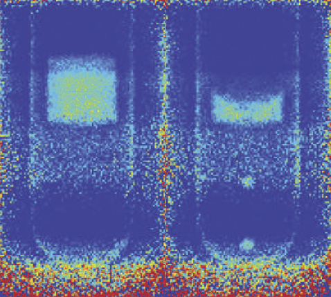 On 11 March 2011 a 9.0-magnitude earthquake and enormous tsunami created human and economic catastrophes in Japan on an almost unimaginable scale. (For more about the earthquake, see the news story on page 22.) Among the infrastructure casualties was the Fukushima Daiichi nuclear power station; more than two years later, the buildings remain almost entirely inaccessible due to high radiation levels. A team from Los Alamos National Laboratory hopes to hasten the dismantlement and remediation efforts by remotely imaging the damaged reactor cores with atmospheric muons produced by cosmic rays. The particles’ penetrating power would produce an x-ray-like image that includes shadows from the denser regions (see the Quick Study by Giulio Saracino and Cristina Cârloganu, Physics Today, December 2012, page 60). But because muons are strongly scattered by uranium and other heavy elements, the researchers plan to use their recently developed method that tracks both incident and transmitted particles using two muon detectors, fore and aft of the building. The resulting scattering information can be used to reconstruct the spatial distribution of fuel materials. To demonstrate the feasibility of the approach, the group tested a detector at Fukushima, radiographed both a mockup reactor and a university research reactor, and performed simulations. The simulation results shown here depict an intact 4-m-diameter core (left) and one that is 70% melted with two 40-cm spheres of debris (right). If the proposal is approved and the equipment installed, a few months of data collection would yield the required information. (H. Miyadera et al., AIP Advances3, 052133, 2013, doi:10.1063/1.4808210.)