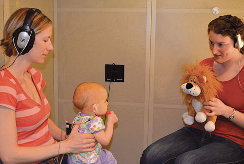 Testing pitch perception. An infant participant listens to a series of harmonic complexes through an earphone. Whenever the fundamental frequency changes, a mechanical toy to the infant’s right (not shown) turns on. The stuffed lion keeps the infant otherwise facing forward. An experimenter observes the infant’s behavior from another room. (Courtesy of Bonnie Lau.)