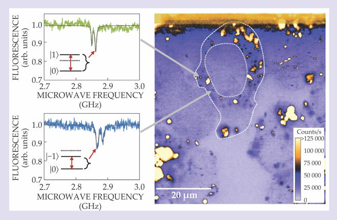 When optically excited, an NV center exhibits a stable fluorescence, even in a diamond crystal as small as 5 nm. Because of interactions among its electrons, the defect has magnetically sensitive spin sublevels in its ground state: a spin-zero level ∣0〉 split from nearly degenerate spin-1 levels ∣±1〉 by a microwave transition of 2.9 GHz. That sensitivity allows one to detect weak magnetic fields by observing the spin state, which can be manipulated by microwave pulses and then read out by monitoring the fluorescence intensity. (The intensity depends on which of the spin states is populated.)