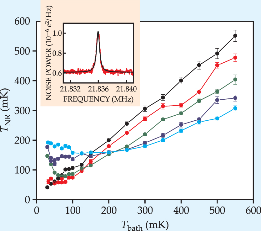 Figure 2. Back action manifests itself, among other ways, in the temperature of the nanoresonator, TNR. That temperature is proportional to the area under the peak in the noise spectrum (like that in the inset) of microwave signals reflected off the SSET. Here TNR is plotted against the surrounding temperature Tbath for resonator–SSET couplings from weak (black) to strong (blue). At the weakest coupling, TNR matched Tbath. At stronger couplings, the resonator is heated at low temperatures and cooled at high temperatures, approaching the SSET’s effective temperature.
