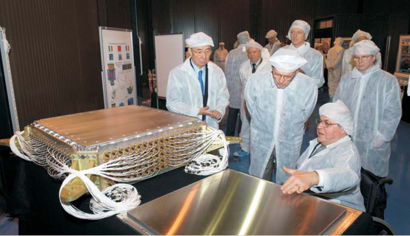 In the clean room, Sam Ting (left), Senator Ted Stevens (R-AK; peering down), the DOE’s Robin Staffin (standing, right), and others inspect the completed Alpha Magnetic Spectrometer’s electromagnetic calorimeter.
