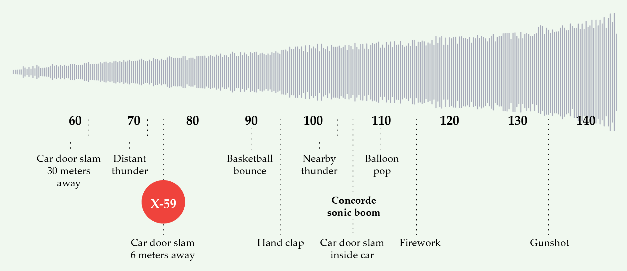 Compared with other short-duration sounds, the boom from NASA’s new supersonic plane, the X-59, is perceived to be about as loud as a car door slamming from a distance of 6 meters. The perceived level in decibels increases from left to right. (Adapted from a diagram provided by NASA.)