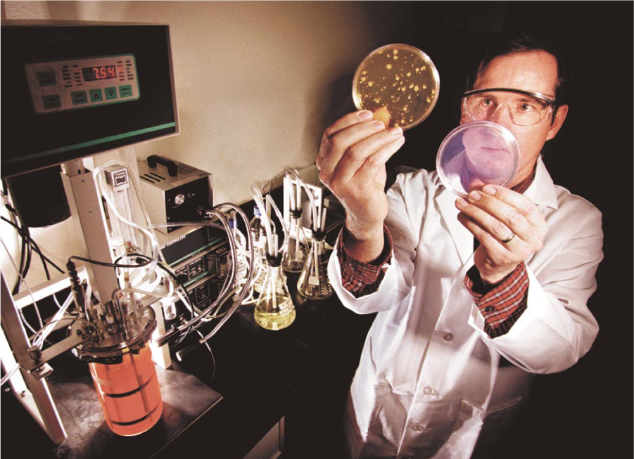 Sandia National Laboratories researcher Mark Tucker examines two petri dishes: one (left) containing a growing anthrax simulant, the other showing the lack of spore growth after treatment with a new decontaminating foam.