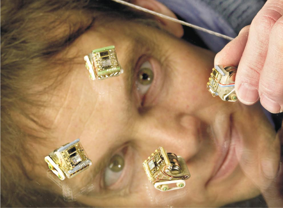 Researcher Doug Adkins inspects a group of tiny robots he and colleague Ed Heller are developing at Sandia. The robots are intelligent and communicate with each other.