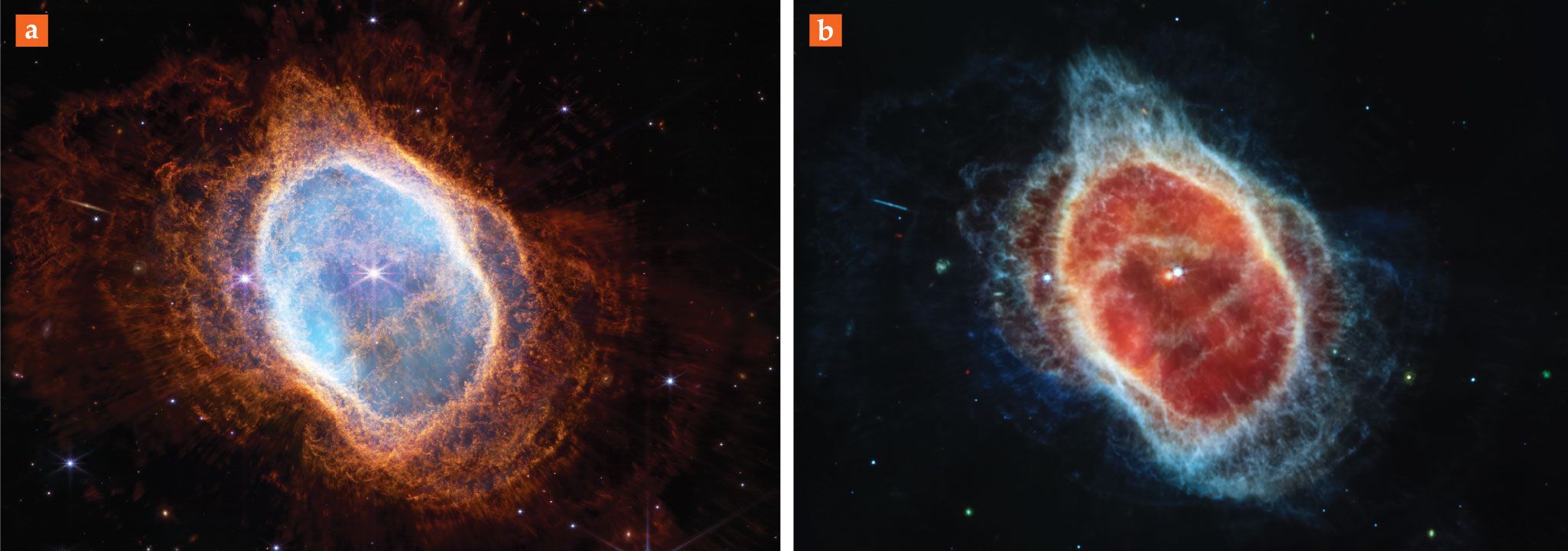 Planetary nebulae are glowing shells of gas that form around intermediate-mass dying stars. The one shown here—NGC 3132, or the Southern Ring Nebula—was among the early objects imaged by the James Webb Space Telescope. (a) The near-IR image resembles earlier ones taken by other telescopes, although the increased light collection reveals a pattern of incomplete concentric rings (most noticeable in the lower right quadrant) in the outermost gas. (b) The mid-IR image surprised astronomers because the dying star, the red center dot, wasn’t expected to emit in the IR. (Courtesy of NASA/ESA/CSA/STScI.)