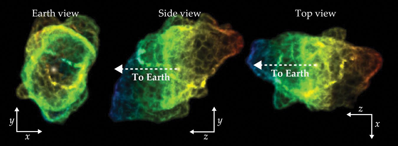 A reconstruction of the Southern Ring Nebula’s ionized gas bubble, shown here at different orientations, clarifies the nebula’s structure and how it relates to stellar interactions. The roughly egg-shaped nebula features bumps that come in pairs on opposites sides. From simulations, researchers propose that the bumps are from pairs of plasma jets ejected by two stars near the dying star. From the bumps and other evidence, they deduce that the nebula’s center hosts four or five stars. The colors here show the Doppler shift of the light that reaches Earth. (Adapted from ref.
