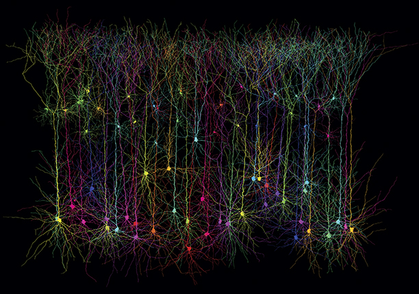 Computer simulations of neural networks are part of efforts by the International Brain Laboratory to understand how neurons work together to drive behavior. This image shows pyramidal cells in the rodent cerebral cortex.