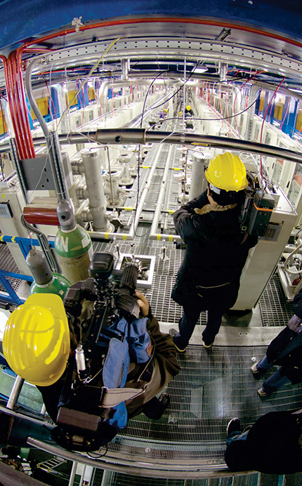 Workers check out ICARUS’s cryogenics. Down the center of the 20-m-long detector is piping for the circulation and purification of 760 tons of liquid argon. The electronics racks along the sides contain nearly 53 000 readout channels.