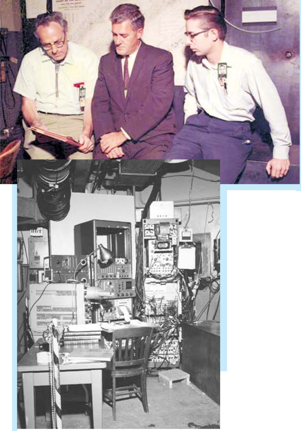 Electronics from electron–neutrino scattering experiments (bottom), schematic diagrams, and photos—this circa 1970 shot (top) shows, from left, Fred Reines, Luke Fox, Savannah River’s superintendent of reactor technology, and Henry Gurr—are among the recovered relics from neutrino experiments that began more than 50 years ago at the Savannah River reactor site.