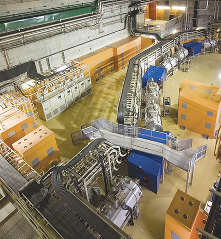 Figure 1. The radioactive isotope projectile separator BigRIPS enabled researchers to isolate enough magnesium-40 for gamma-ray spectroscopy. The separator was part of the upgrade to RIKEN’s facility in 2007 and is used to separate the isotopes produced by the primary beam’s breakup into secondary beams. BigRIPS allows for higher-intensity beams than its predecessor, RIPS, because of its larger apertures and two-stage separation scheme. (Photo courtesy of RIKEN Nishina Center.) Figure 2. The Radioactive Isotope Beam Factory at RIKEN uses a high-intensity calcium-48 beam to generate exotic isotopes. (a) A beam of aluminum-41 nuclei (circled in red) can be clearly identified after the breakup of the primary 48Ca beam on a beryllium target. (b) A small number of nuclei from the 41Al beam lose a proton after interacting with a reaction target and become magnesium-40. As excited states in those nuclei quickly transition to the ground state, they emit gamma rays whose energies provide insight into the nuclear structure. (Adapted from ref.