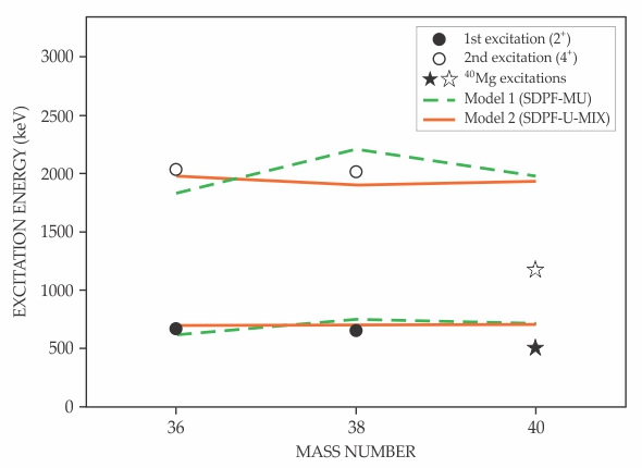 As a calibration, the researchers first remeasured the energies associated with the first two excited states in 36Mg and 38Mg. The values matched both previous experiments and theoretical calculations of the excited state energies, as shown in figure