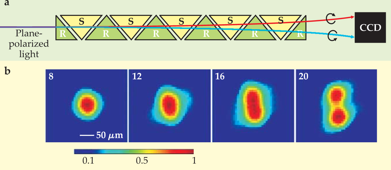 Beam splitting by chiral molecules. (a) Cuvettes filled with a solution of left-handed, or sinister (S), chiral molecules alternate with cuvettes of right-handed, or rectus (R), molecules. The net result of the arrangement is to increase the divergence of the right- and left-handed circularly polarized components of the incident plane-polarized light. (b) The splitting increases with the number of cuvettes (shown in the upper left of each image) until the two distinct beams are resolved. Color scale indicates intensity.