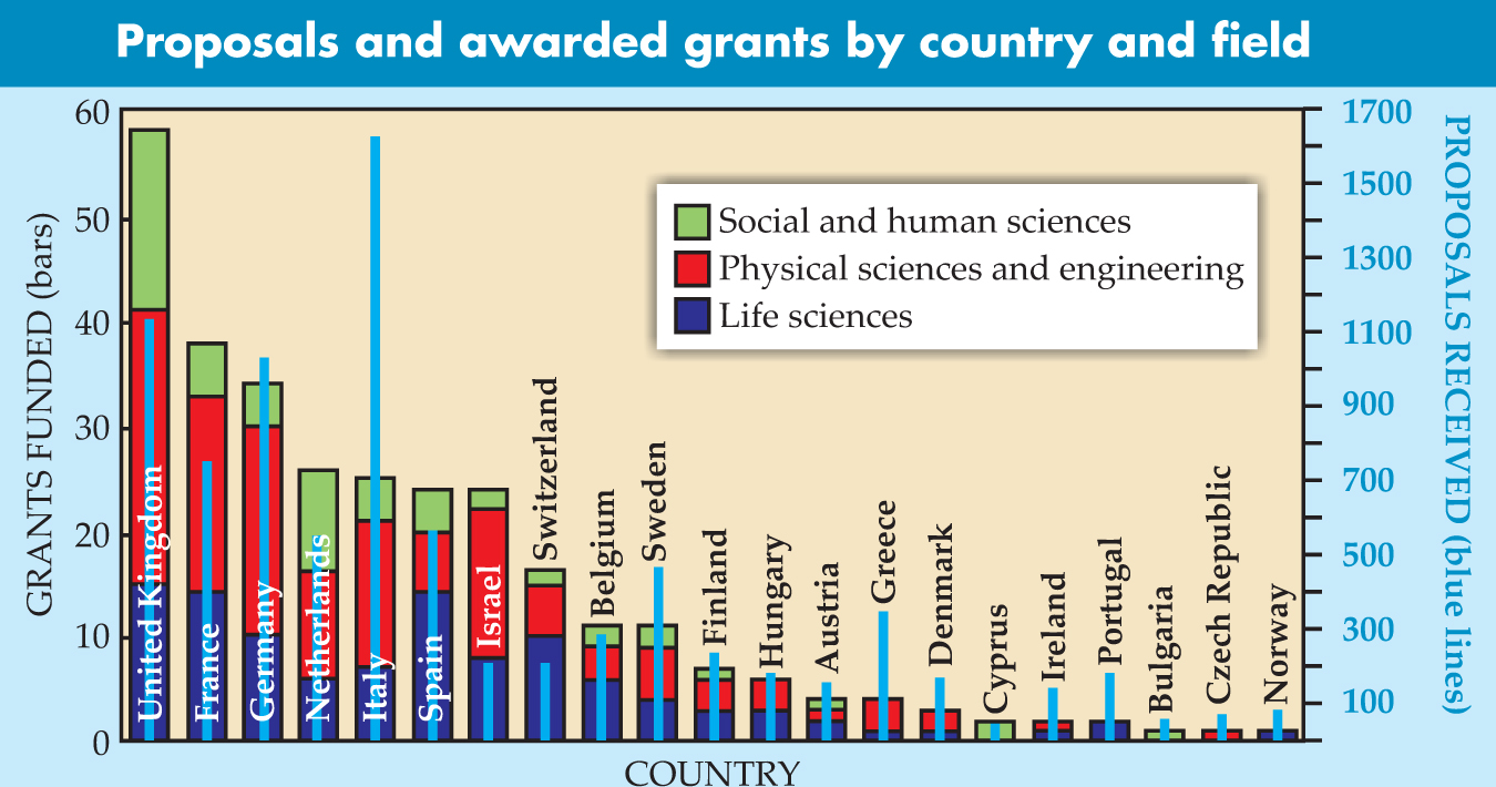 Awarded grants (left axis, bars) and proposals (right axis, blue lines) in the European Research Council’s first grant competition. The colors show the successful grants by subject. Proposals submitted from countries that did not receive any grants are not shown.