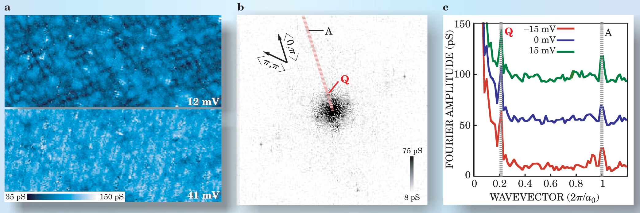 Figure 1. Charge order in underdoped BSCCO aboveTc, as determined by scanning tunneling microscopy. (a) Conductance maps. Below the peudogap energy, at a tip-to-surface bias of 12 mV, one can see a pattern of charge order amid an inhomogenous background. Above it, at 41 mV, one sees modulations due to atoms and a known lattice distortion. The field of view is 45 nm by 19.5 nm. (b) Fourier transform of conductance map reveals four points (one of which is labelled A) associated with atomic sites and four points (Q) due to charge ordering. The copper– oxygen bonds are oriented along the <0, π> direction. (c) Wavevectors at Q and at A show no change with bias voltage.