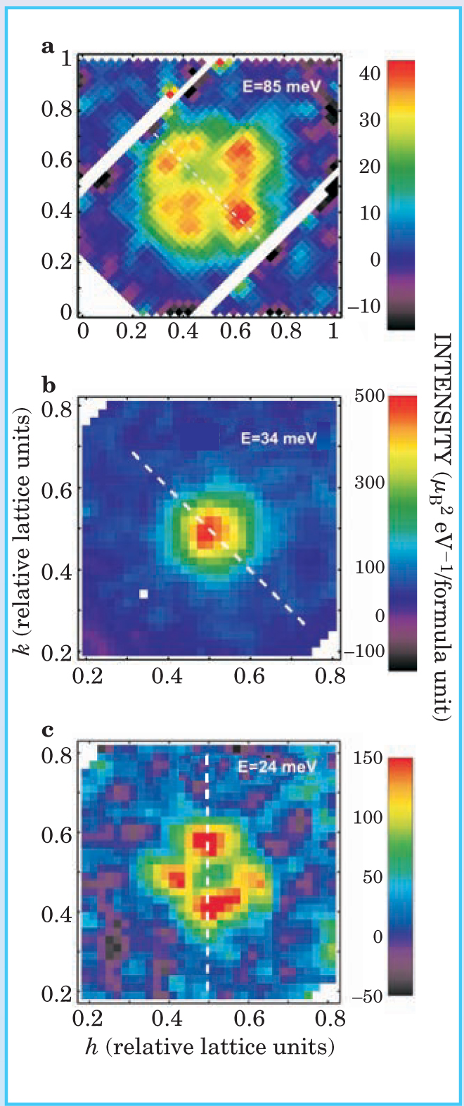 To explore whether the spin modulation is two dimensional or one, a group led by Bernhard Keimer of the Max Planck Institute for Solid State Research in Stuttgart, Germany, and by Philippe Gourges from the Laboratoire Léon Brillouin in Saclay, France, measured the neutron scattering from a crystal whose copper oxide planes were nearly all aligned in the same direction.