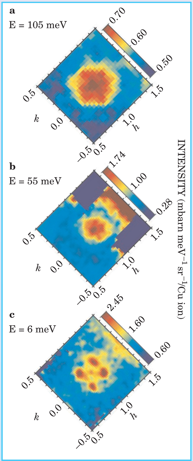 Figure 3. Superconducting YBCO. The neutron scattering diffraction patterns at three energies follow the same trend as in a stripe-ordered compound, LBCO, as seen in figure 4. The square pattern of peaks at 24 meV (c) coalesce toward the center by 34 meV (b), then spread outward again by 66 meV (a).