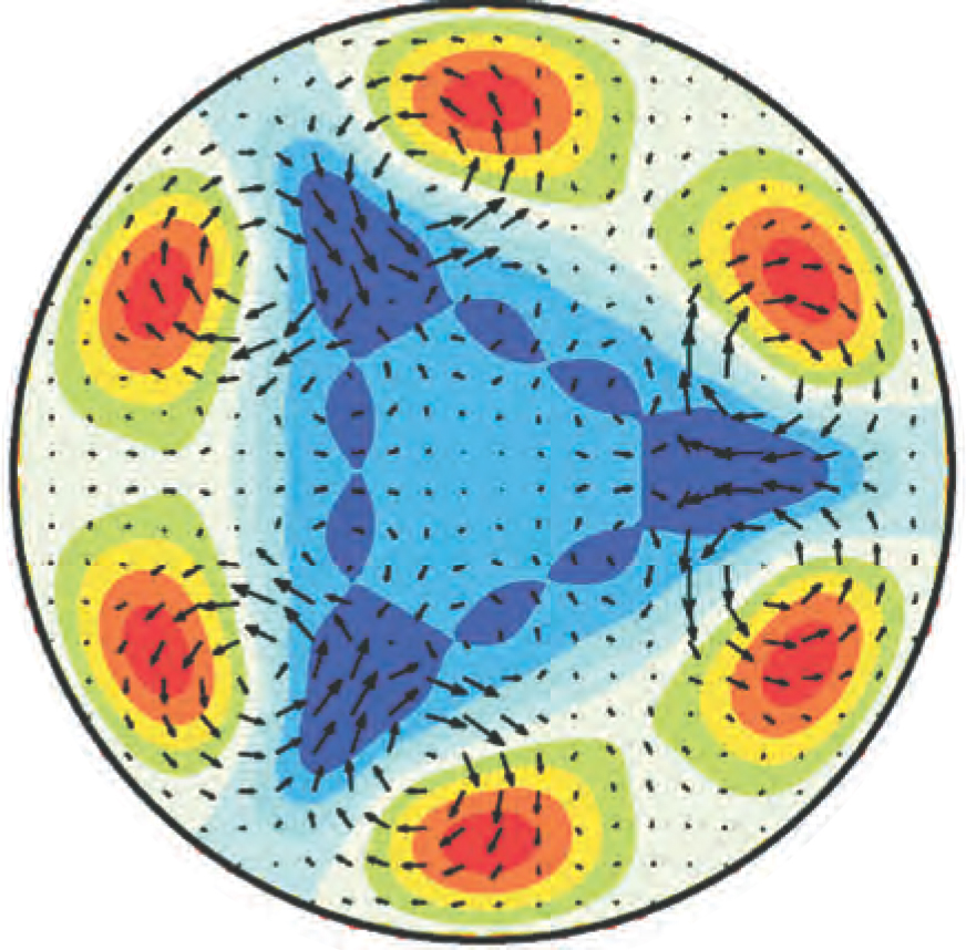 Figure 3. A traveling-wave solution for flow in a pipe. The vectors indicate in-plane motion. The colors denote the local downstream flow velocity: blue is slow and red, fast. The downstream motion has been averaged over a wavelength. Such states may play a role in the transition from laminar flow to turbulence.