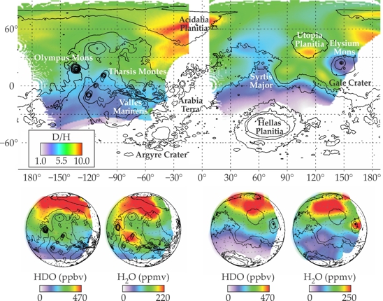 The resulting maps, each captured during a two-hour time window and with a resolution of 500 km, span a quarter of the Martian seasons—from late winter to late spring. That’s an especially interesting time of year when the north polar ice cap sublimes and replenishes the northern hemisphere with water vapor. Figure 1 shows part of the cycle. Although the measured polar D/H ratio punctuates the record of water’s historical evolution on the planet, the local variations in D/H, between 1 and 10 VSMOW, can reveal the richness and subtleties of its present climate.