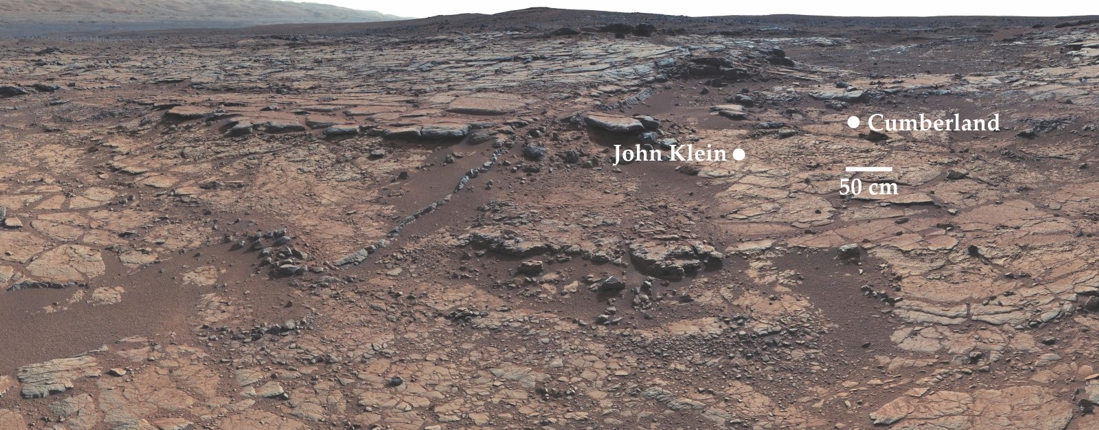 Figure 2. Yellowknife Bay, photographed by the Mars rover Curiosity on 9 December 2013 inside Gale Crater. With its telltale geologic formations, sedimentary rocks, and clay minerals, the crater is thought to be an ancient lake bed. To derive a D/H value for the atmosphere about 3.2 billion years ago, Curiosity analyzed clay samples named John Klein and Cumberland with its spectrometers. The foothills of Mount Sharp, the rover’s eventual destination, are visible in the distance on the left. (Courtesy of NASA/JPL-Caltech/MSSS.)