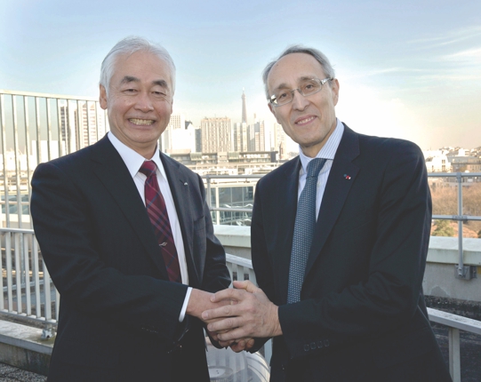 Outgoing ITER director general Osamu Motojima (left) welcomes his successor Bernard Bigot. The change in leadership occurred on March 5.
