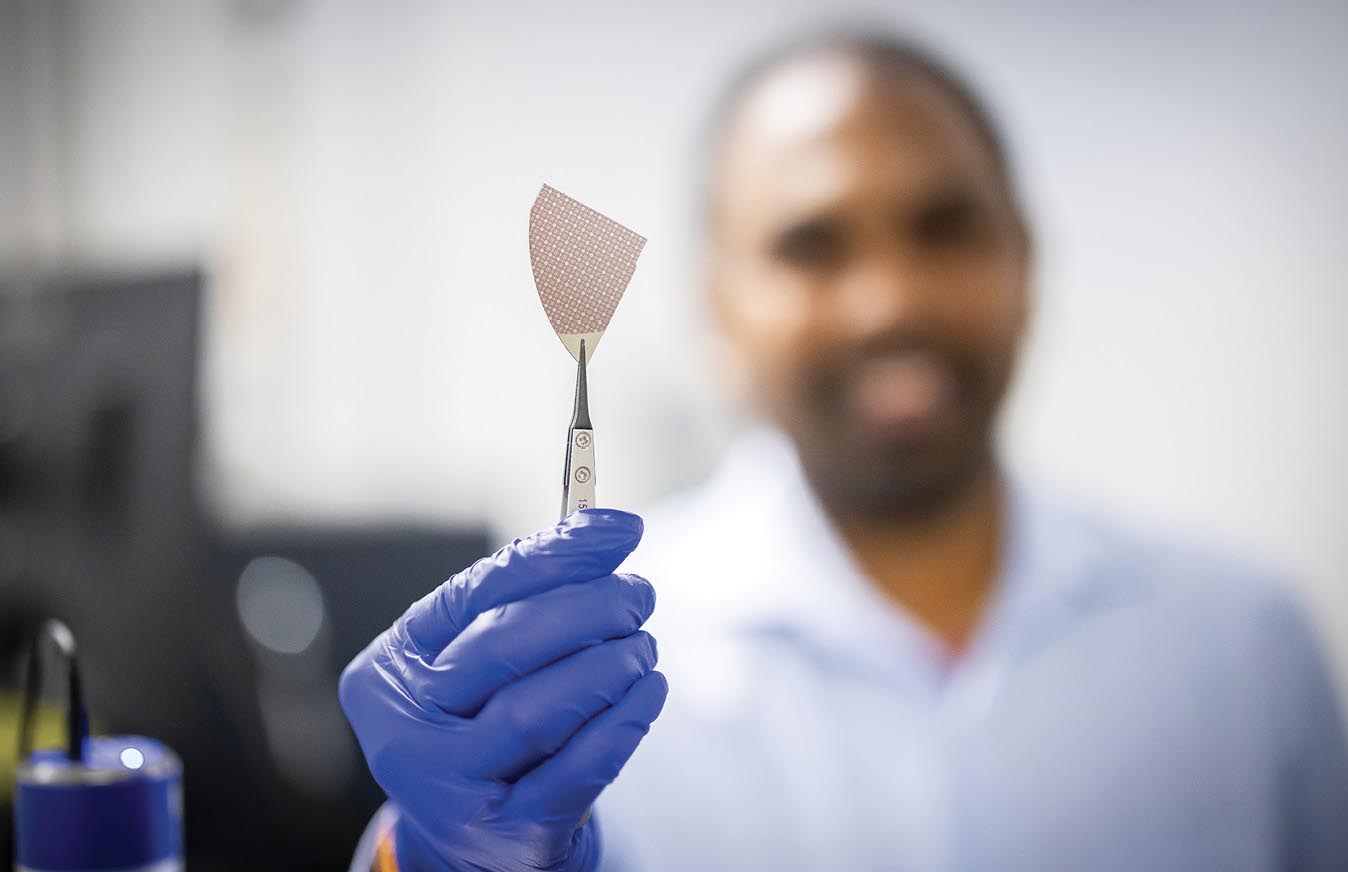 Dhiren Pradhan, a materials scientist at the University of Pennsylvania, displays a heat-resistant ferroelectric memory device. (Image from Dhiren Pradhan.)