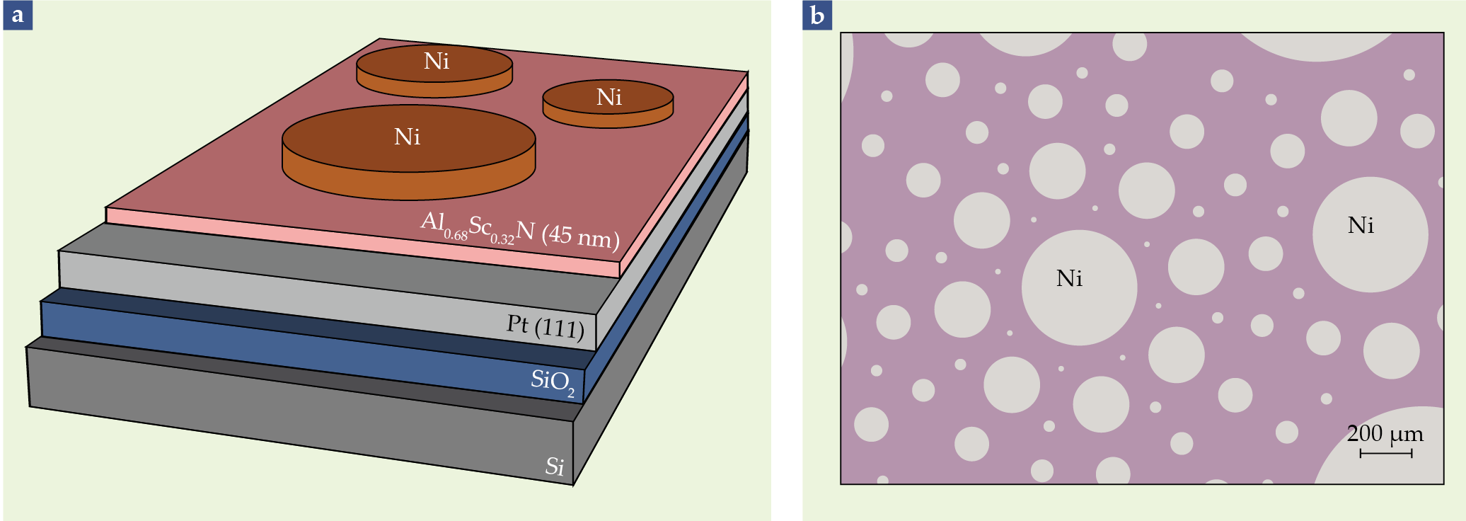 A ferroelectric memory device, in schematic. (a) Aluminum, scandium, and nitrogen were sputtered onto a 150 nm film of platinum and silicon dioxide on a silicon substrate. Nickel-metal electrodes were then photolithographically deposited atop the AlScN. (b) A cross section of the device is shown as it would appear in optical microscopy. (Image adapted from D. K. Pradhan et al., Nat. Electron. 7, 348, 2024.)