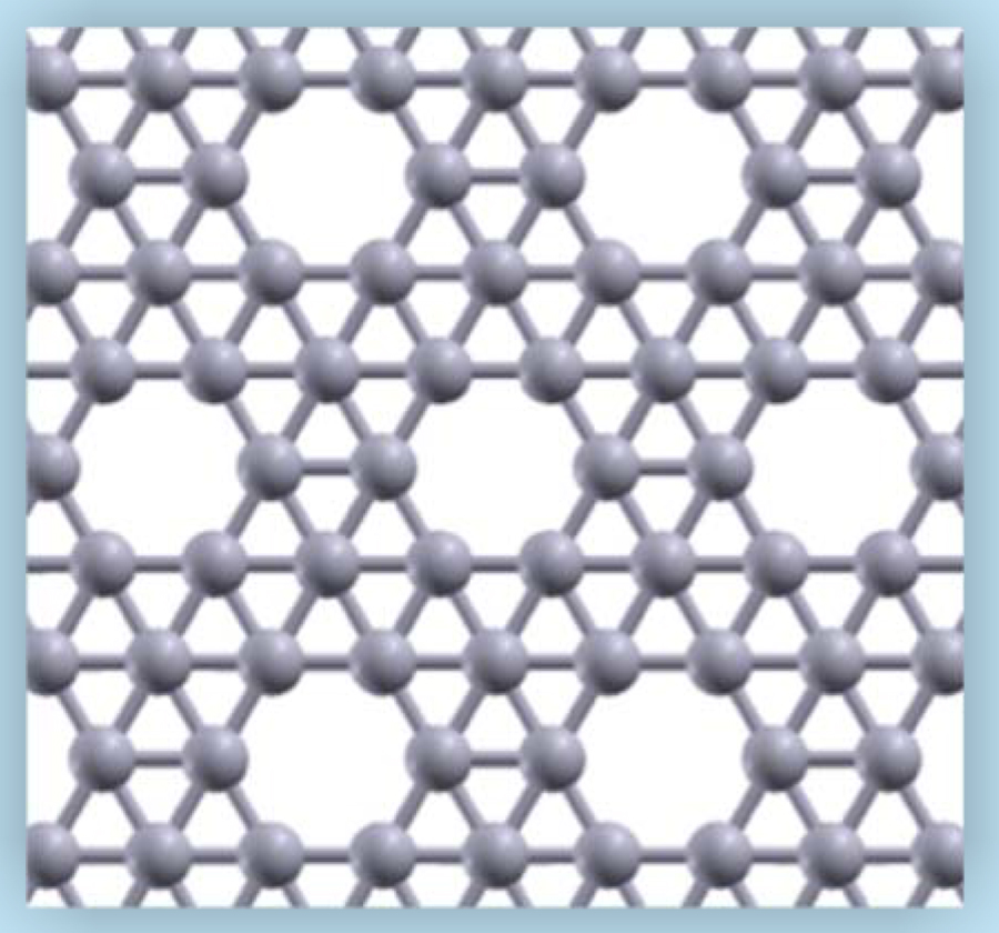 Tang and Ismail-Beigi considered a new class of sheet structures, derived from the triangular lattice but with some atoms removed to form hexagonal holes. They found that both the number and the arrangement of the hexagonal holes affect the sheet’s energy. The optimal density is one hole for every nine atoms in the original triangular lattice, and the optimal hole arrangement tends to be as evenly spaced and far apart as possible. Of all of Tang and Ismail-Beigi’s structures, the lowest in energy is thus the one shown in figure 1. But they found many other structures that were lower in energy than the buckled triangular lattice. The researchers considered buckled versions of their structures too, but found the flat versions to be lowest in energy.