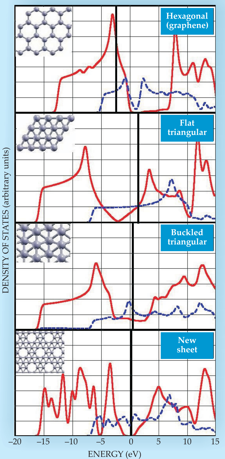 Figure 2. The density of states calculated for several boron-sheet structures. The states are divided into in-plane (solid red line) and out-of-plane (dashed blue line) orbitals. The black vertical lines correspond to the Fermi energies, which mark the boundary between filled states to the left of the line and empty states to the right. In each of the flat structures—the hexagonal lattice, the flat triangular lattice, and the new sheet—the boundary between bonding and antibonding orbitals is marked by a zero in the density of in-plane states.