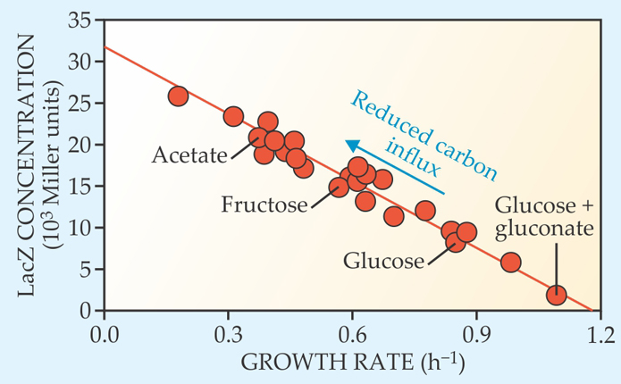 The group’s model was inspired by an experiment carried out by Conghui You, a postdoc in Hwa’s lab. In the course of growing E. coli on more than a dozen different carbon sources, she discovered that concentrations of LacZ, one of the cAMP-activated enzymes affected by catabolite repression, seemed to obey a simple, generic trend: When plotted against growth rate, as shown in figure 1, it always fell on the same downward sloped line—regardless of the nutrient composition. The concentrations of half a dozen other cAMP-activated enzymes were observed to behave in the same way.