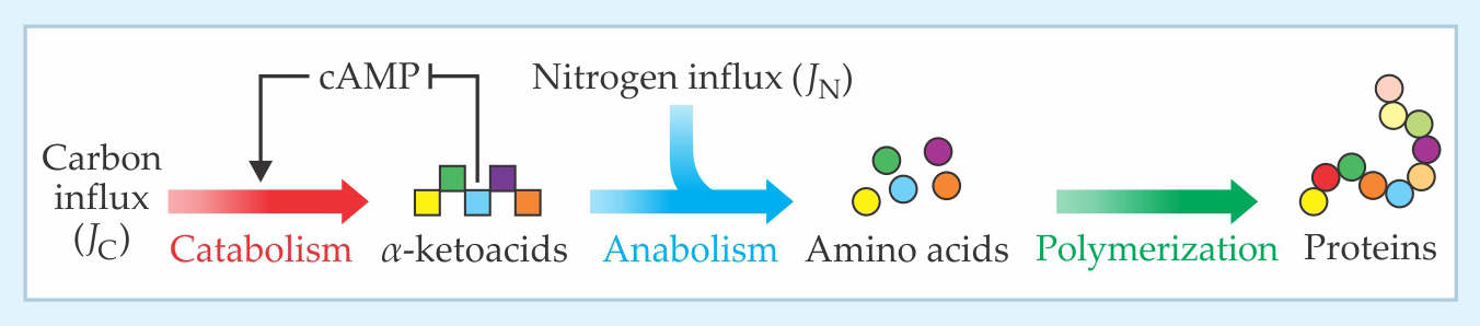 Figure 2. In a coarse-grained model of Escherichia coli metabolism, catabolic proteins degrade carbohydrates into molecules known as α-ketoacids; anabolic proteins assimilate nitrogen and convert α-ketoacids into amino acids; and ribosomal proteins polymerize amino acids to build new proteins. The α-ketoacids accumulate or deplete depending on the relative carbon (JC) and nitrogen (JN) fluxes. A balance is maintained with the help of a negative feedback loop, in which α-ketoacids inhibit the production of cAMP, a messenger molecule that activates the synthesis of catabolic proteins. (Adapted from ref.